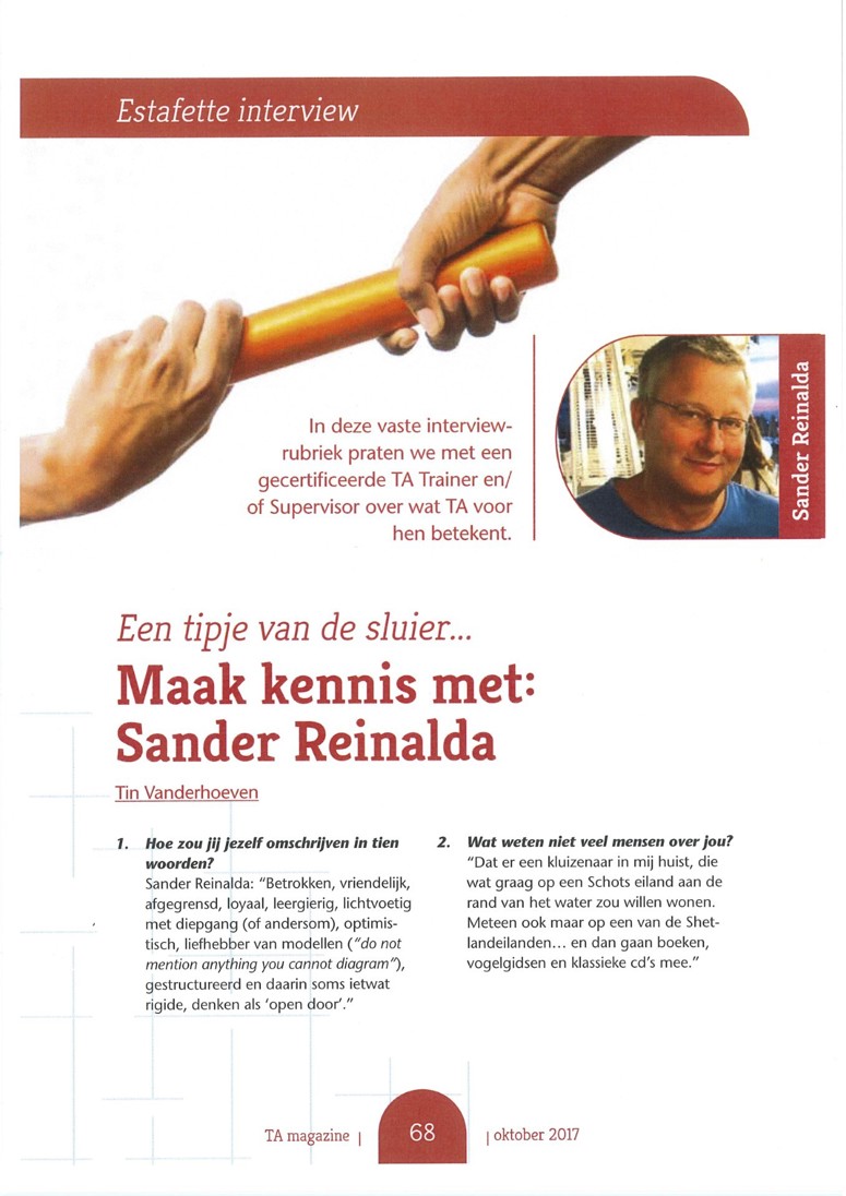 Sander Reinalda is Trainer en Supervisor Transactional Analysis. In dit artikel uit TA Magazine spreekt hij met Tin Vanderhoeven over wat TA voor hem betekent.