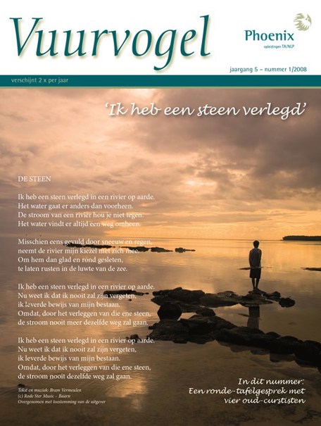 Dit keer een volle Vuurvogel, dus dompel je onder. Verdiep je in het interview met onze spin in het web: ze verlegt heel wat stenen voor Phoenix. Geniet van de beelden en gedichten. Laat je meevoeren in de stroom van het verhaal. Put uit de boekbronnen van oud-phoenix cursisten, voel mee hoe Herman zijn woorden polijst, oefen je in het verleggen van stenen. In een gesprek met 4 oud-cursisten, waarvan de stromen verrassende wegen vinden, zoekt Wibe naar de stenen die het verschil maakten.